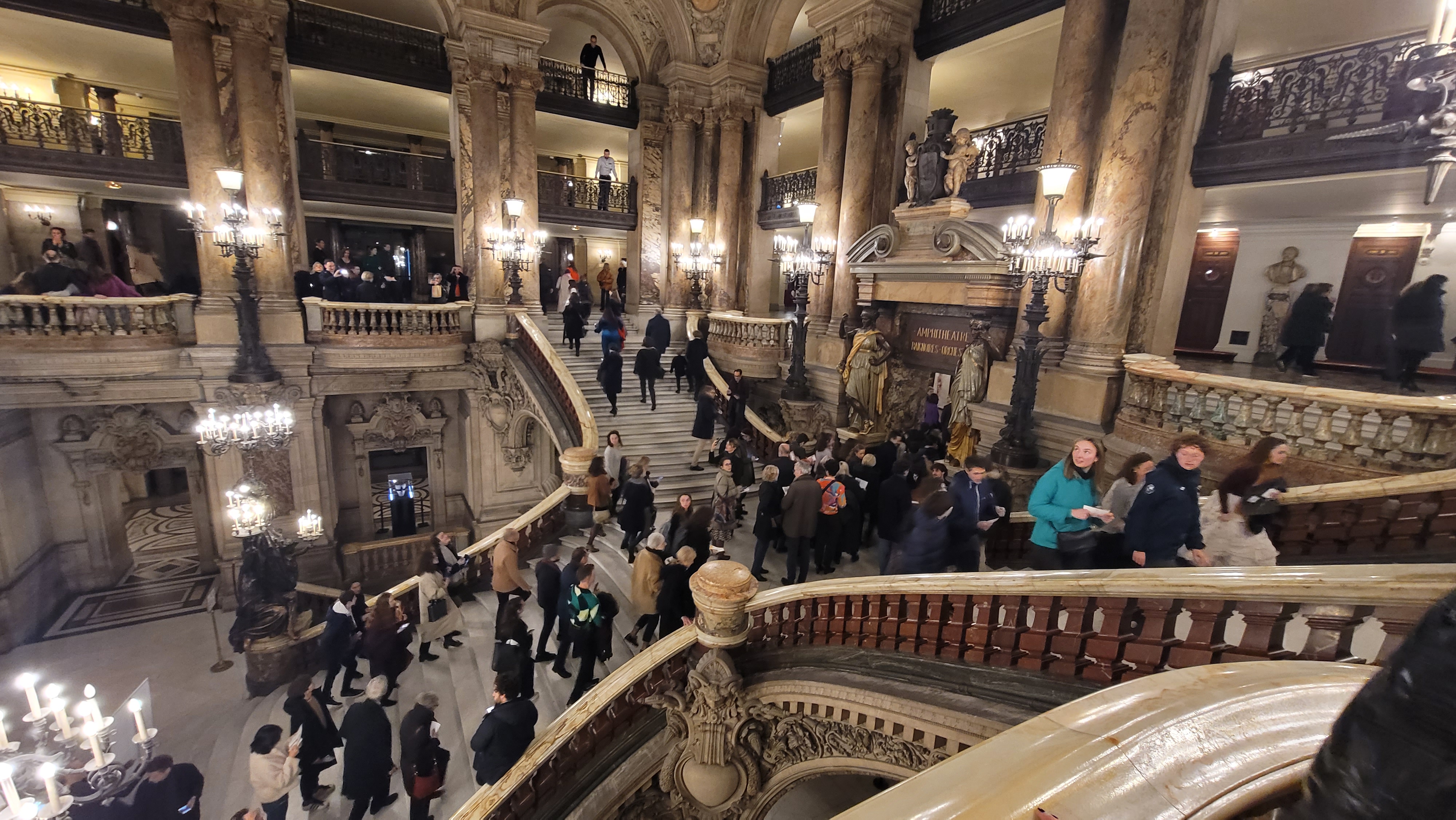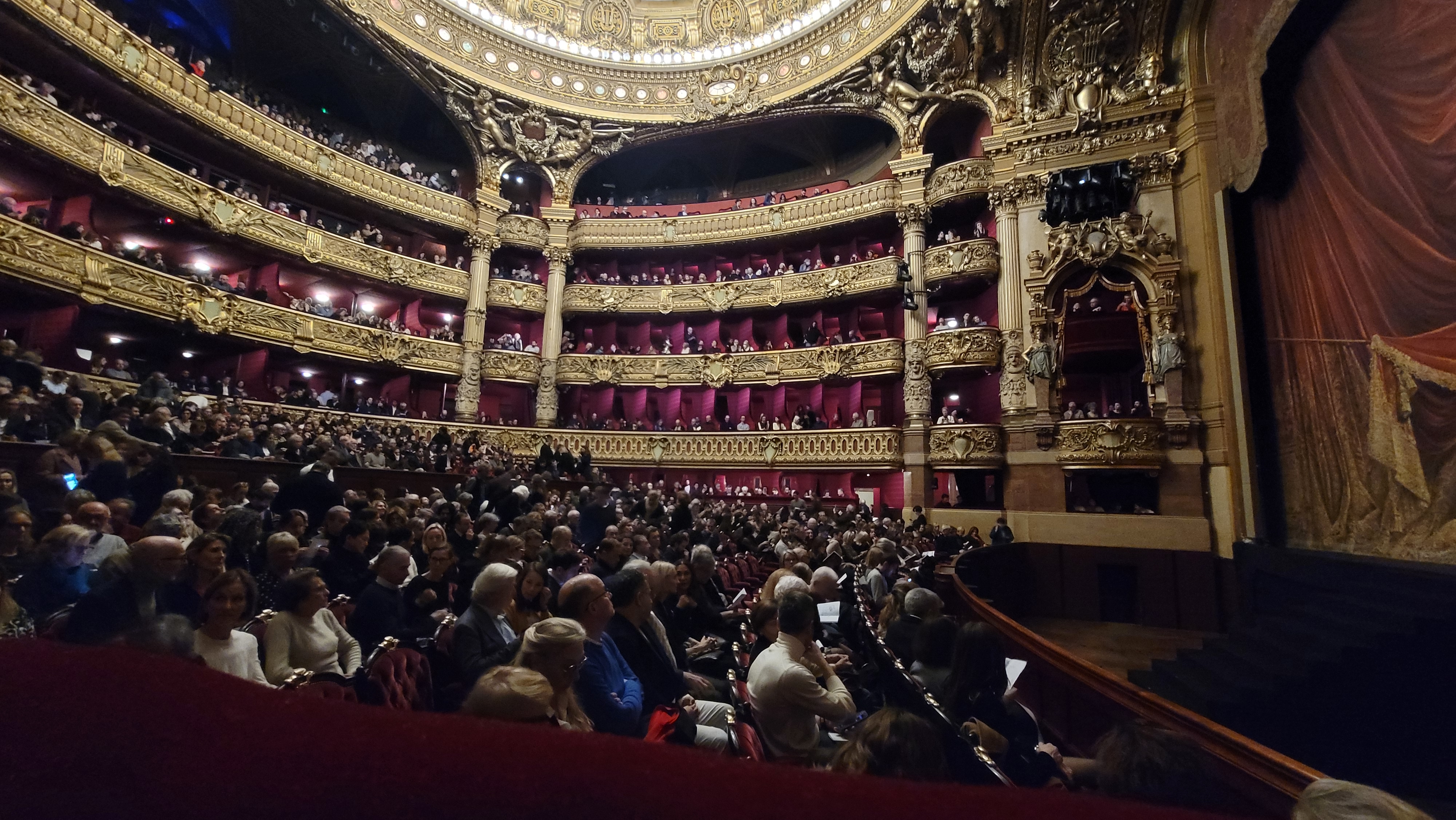 어쨌든 공연 당일. 토요일 밤의 파리 오페라 주변은 비가 추적추적 내리는 겨울 날씨인데도 사람이 막 흘러다니는 분위기였다. 보수중이라 건물 앞부분은 차폐막으로 가려져 있었는데, 그 차폐막까지도 명품 광고... 그리고 극장 안으로 들어간 순간, 숨이 턱 막혔다.