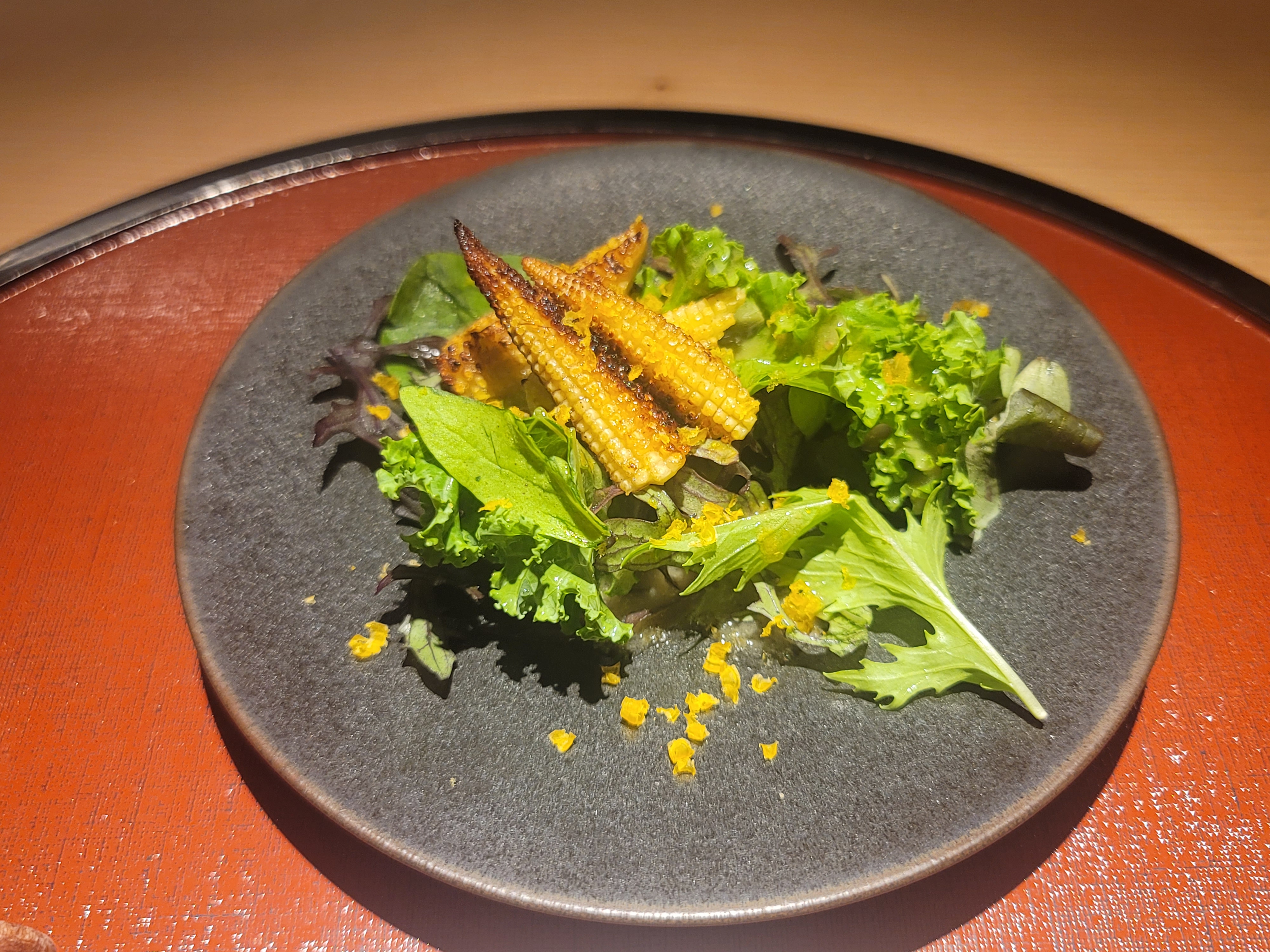 이쯤 되니 셰프와 장난을 치고 싶어진다. "닭을 먹으러 왔는데 닭은 어디 있나! 닭을 달라!"고 항의(?)를 하니 "닭 기름에 튀긴 미니 옥수수"라고 대답한다. 실제로 옥수수에서 꽤 진한 맛이 났다.