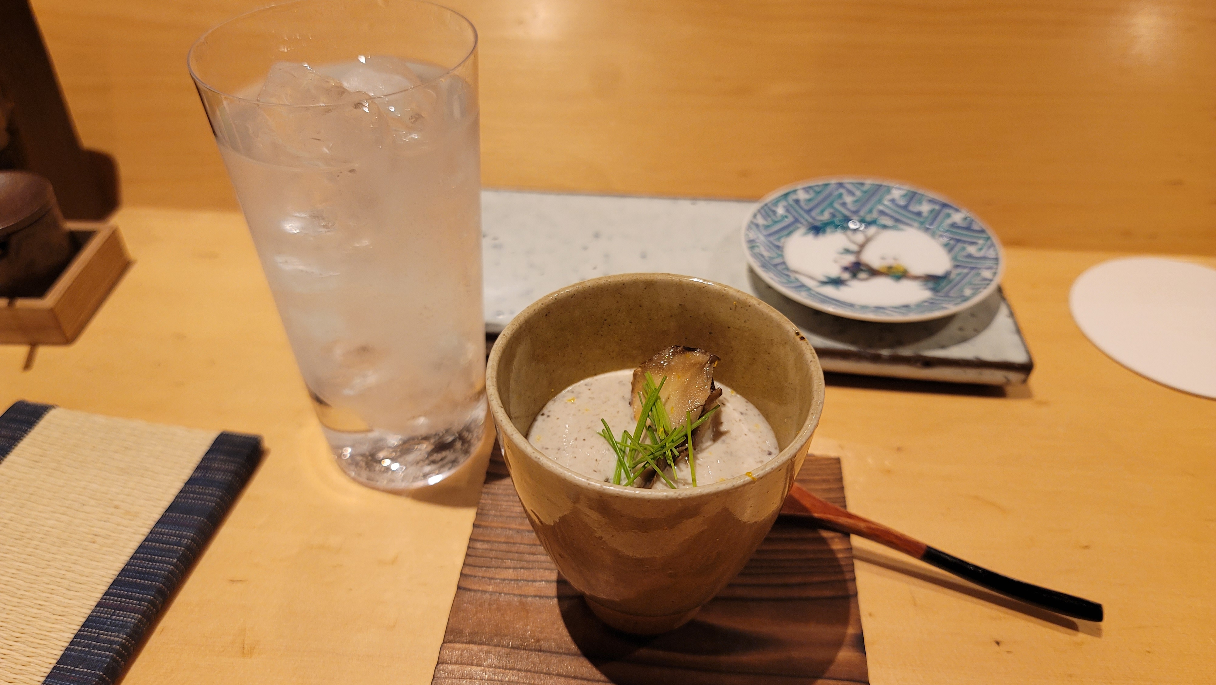 딱 한잔은 아니 할 수 없는 분위기라 역시 깔끔한 쇼추 하이볼 주문. 녹진한 수프로 시작한다.