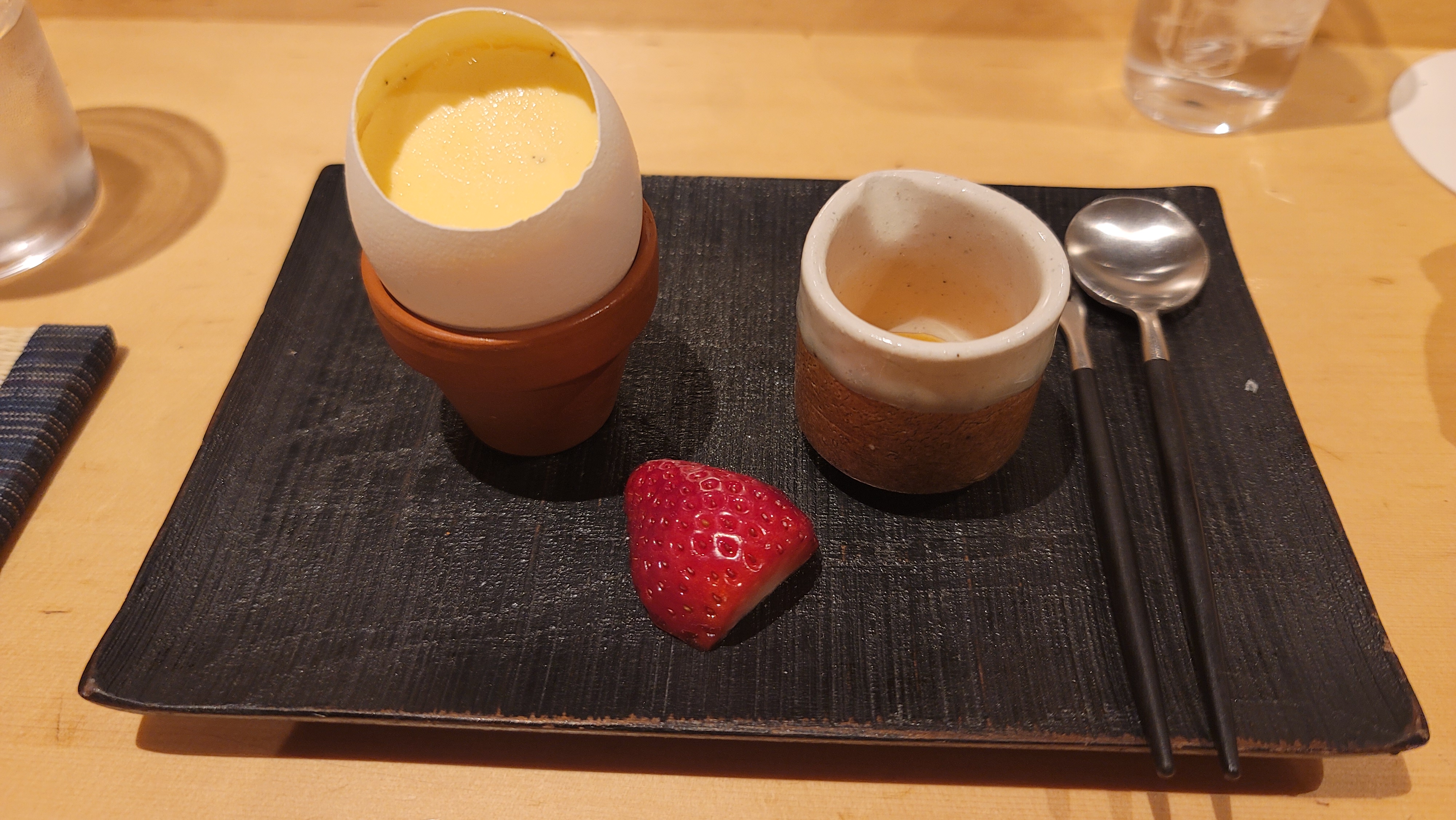 녹진한 푸딩, 차, 딸기 반쪽. 계란껍질을 식기로 쓰는건 별로 안 좋아하는데 아무튼 이 집 전통인듯.