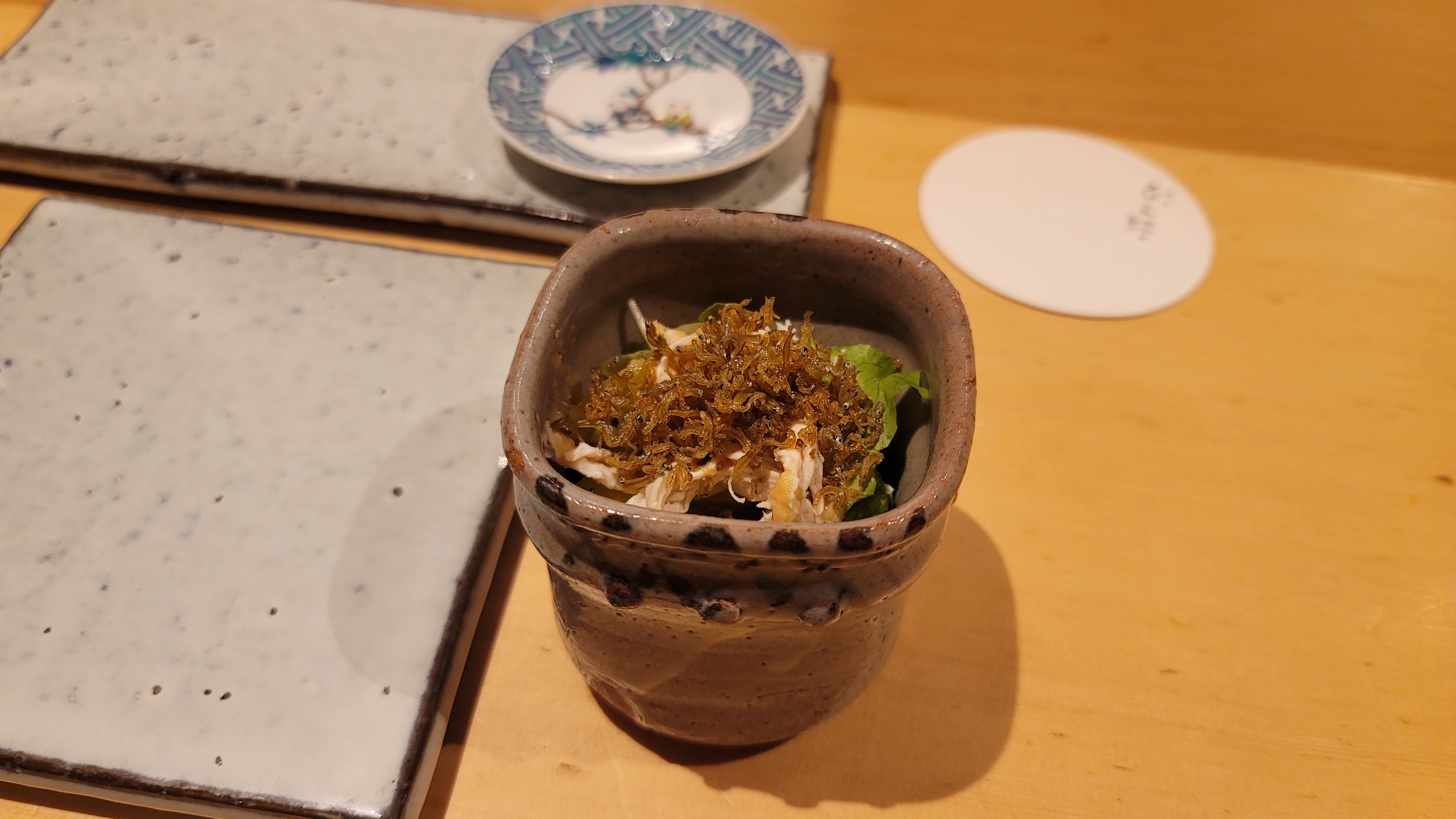 이어 잔 멸치와 닭가슴살을 들깨 드레싱에 무친 전채. 실패 없는 조합. 근데 솜씨가 좋다.
