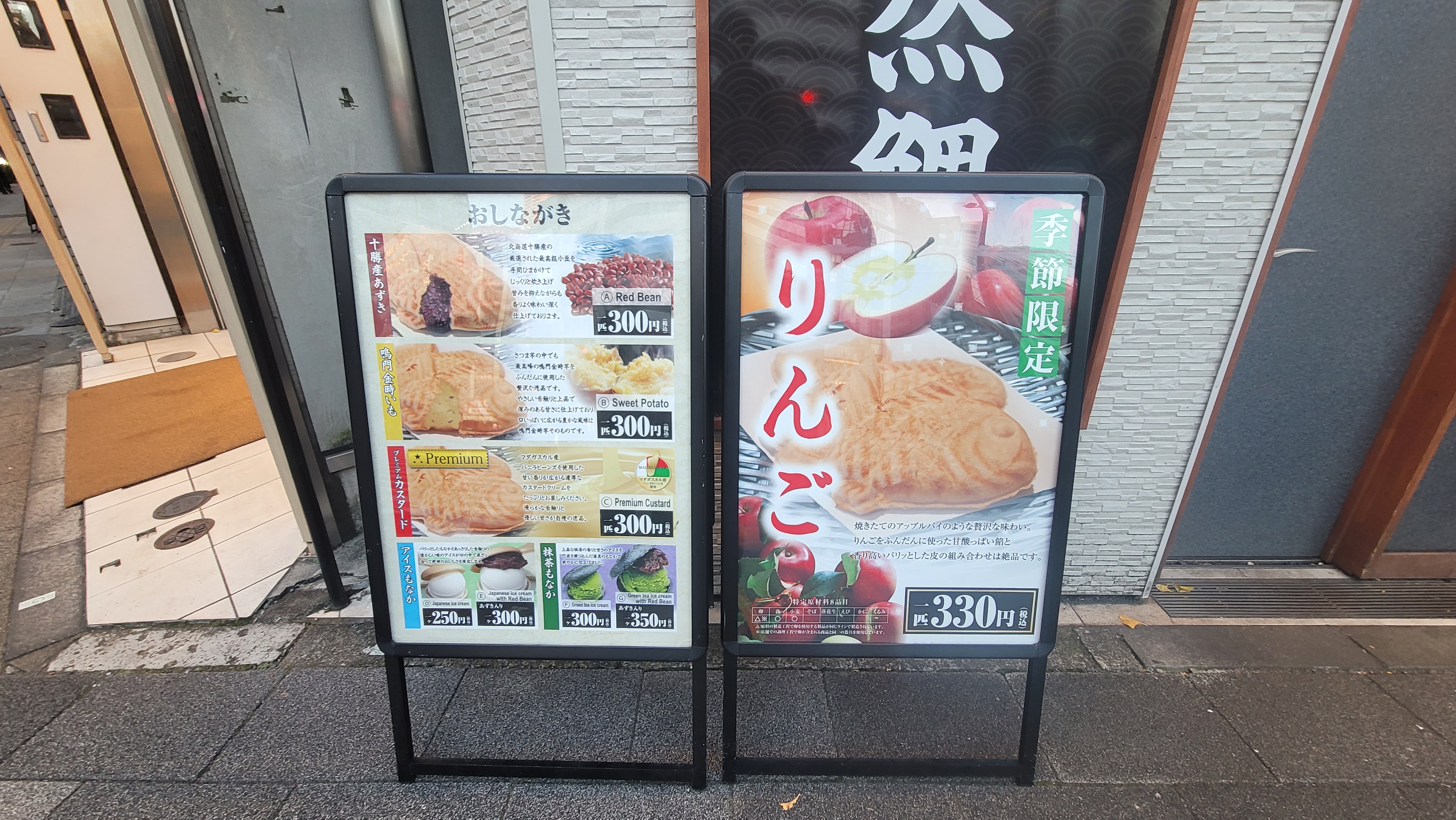 돔과 붕어의 몸값 차이가 있으니, 한국의 붕어빵과 일본의 타이야키는 몸값 차이가 어마어마하다. 팥, 고구마, 크림이 든 타이야키는 300엔. 계절 한정 상품인 사과가 든 것은 330엔.