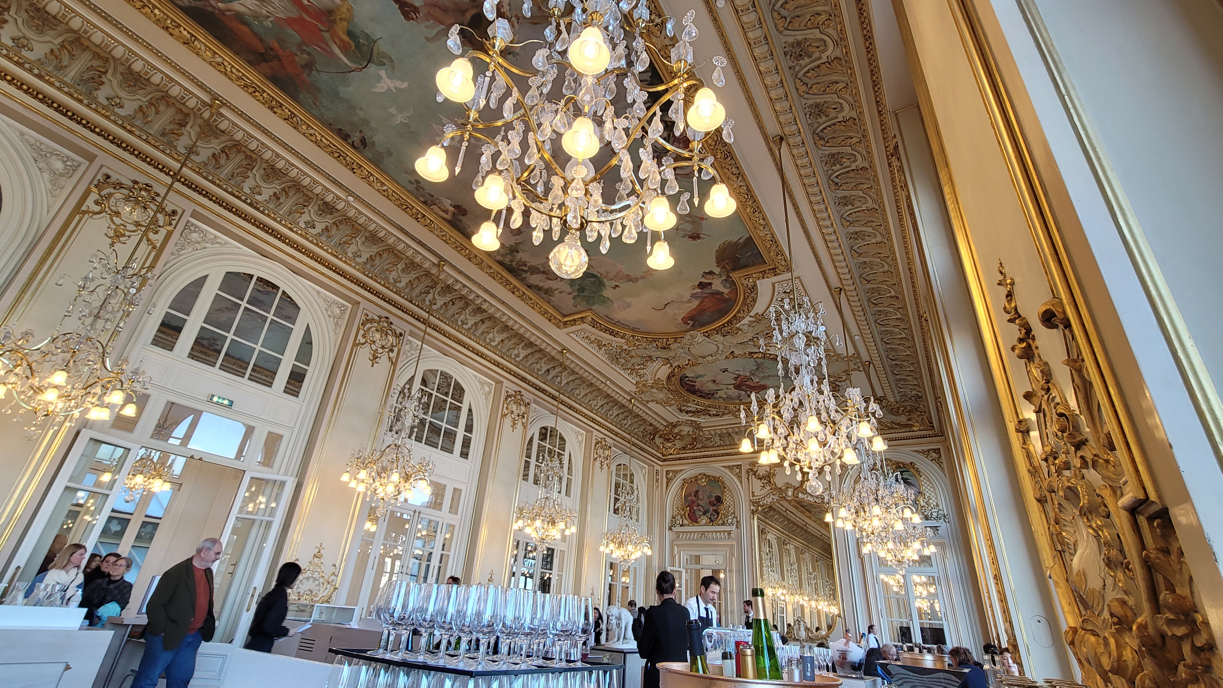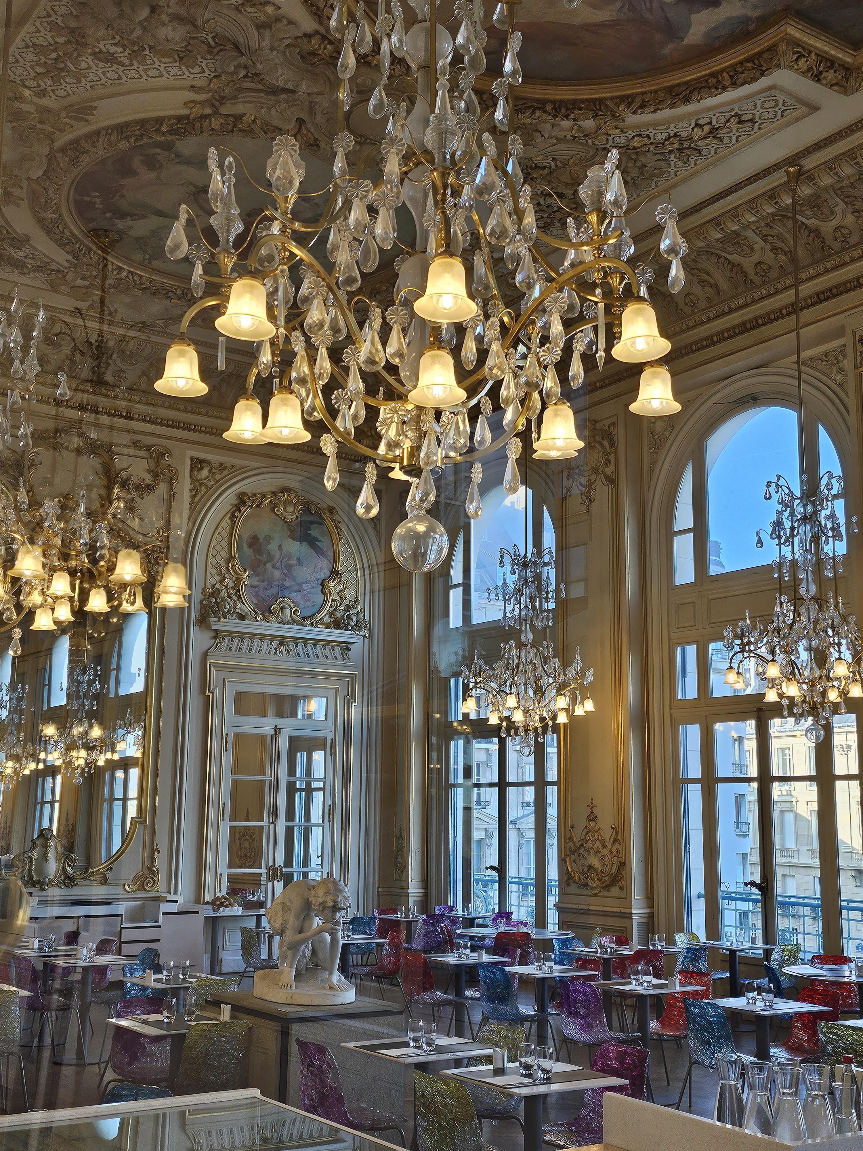 오래된 궁전의 한 방처럼 꾸며진 천장, 창, 샹들리에, 조각들과 캐주얼한 느낌의 테이블과 의자가 묘하게 잘 어울리는 느낌. 아주 마음에 들었다.