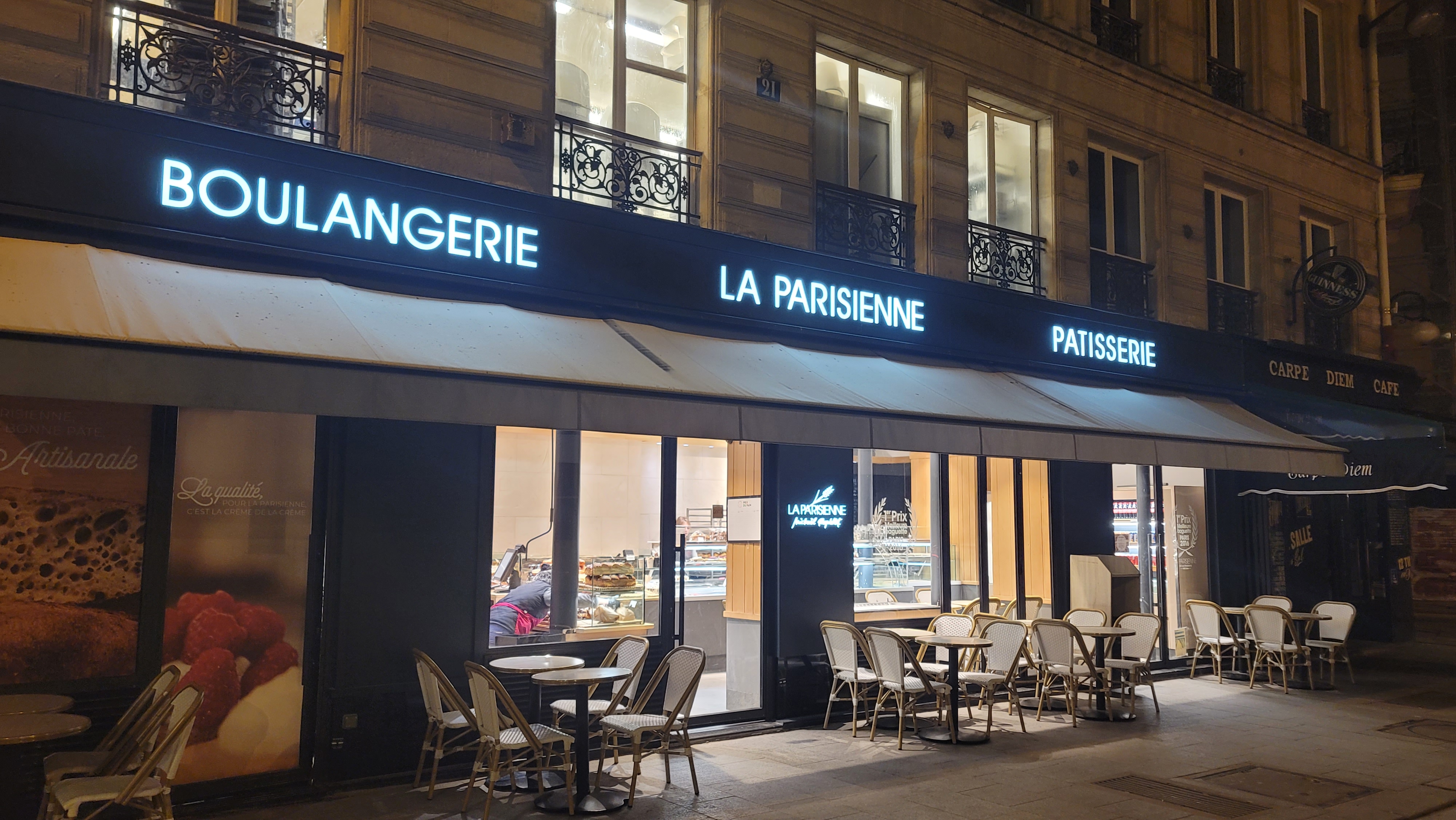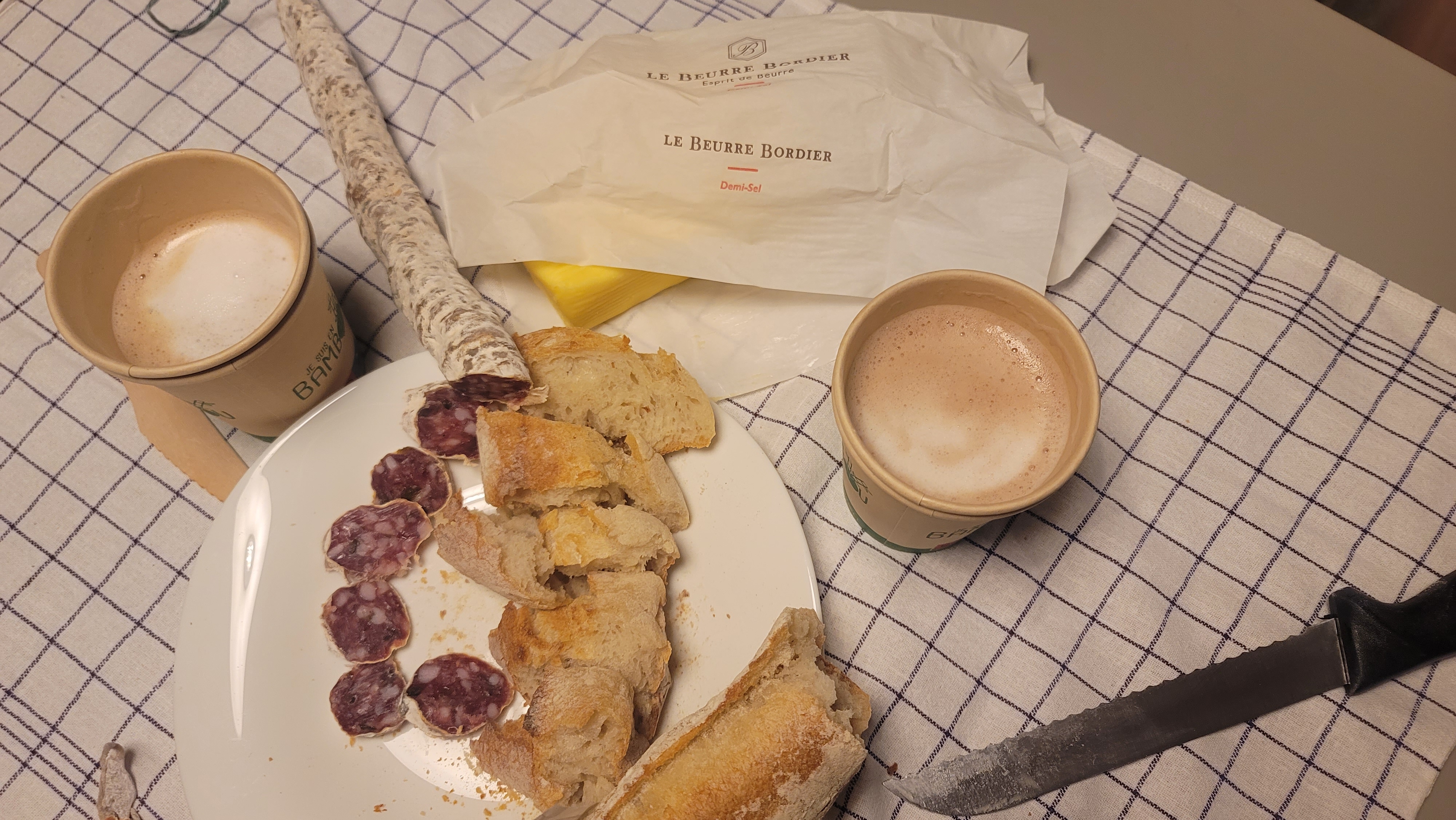 호텔 주변에 대형마트와 아침에 문을 여는 유명한 빵집, 라 파리지엥(La Parisienne)이 있다는 건 미리 알고 있었다. 아침마다 7시에 문을 여는 빵집에 달려가 갓 구운 바게트와 크루아쌍 등을 사왔고, 호텔 1층에서 역시 오전에만 주는 핫 초콜렛을 컵에 받아다 아침을 먹었다. 봉마르셰에서 사 온 버터와 소시숑을 곁들였고, 근처 마트에서 과일과 요구르트를 사왔다.