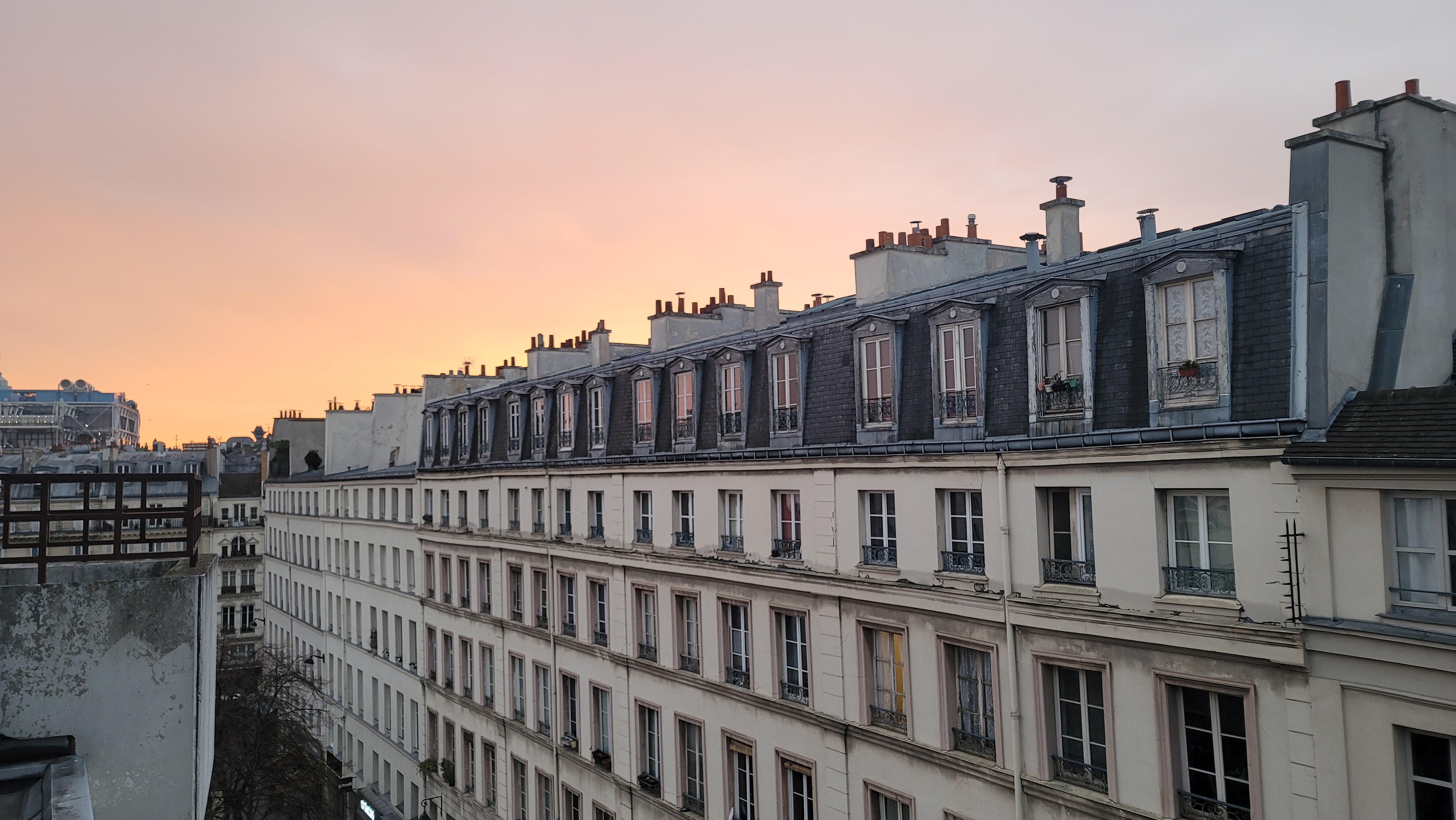 호텔 앞 건물 지붕 너머로 보이는 일출
