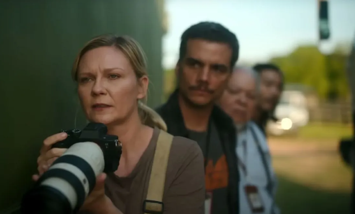 시작 부분. 뉴욕에 머물던 베테랑 저널리스트 리(커스틴 던스트)는 서부군의 우세 속에 워싱턴에 고립된 대통령을 인터뷰하겠다는 야심찬 계획을 세운다. 전쟁의 끝을 보기 전, 벙커에 숨은 독재자는 대체 무슨 말을 할지가 가장 세상이 궁금해 하는 뉴스일 것이라 판단한 것이다(가능만 하다면야 누군들 1945년 8월의 히틀러를 인터뷰하고 싶지 않았을까).