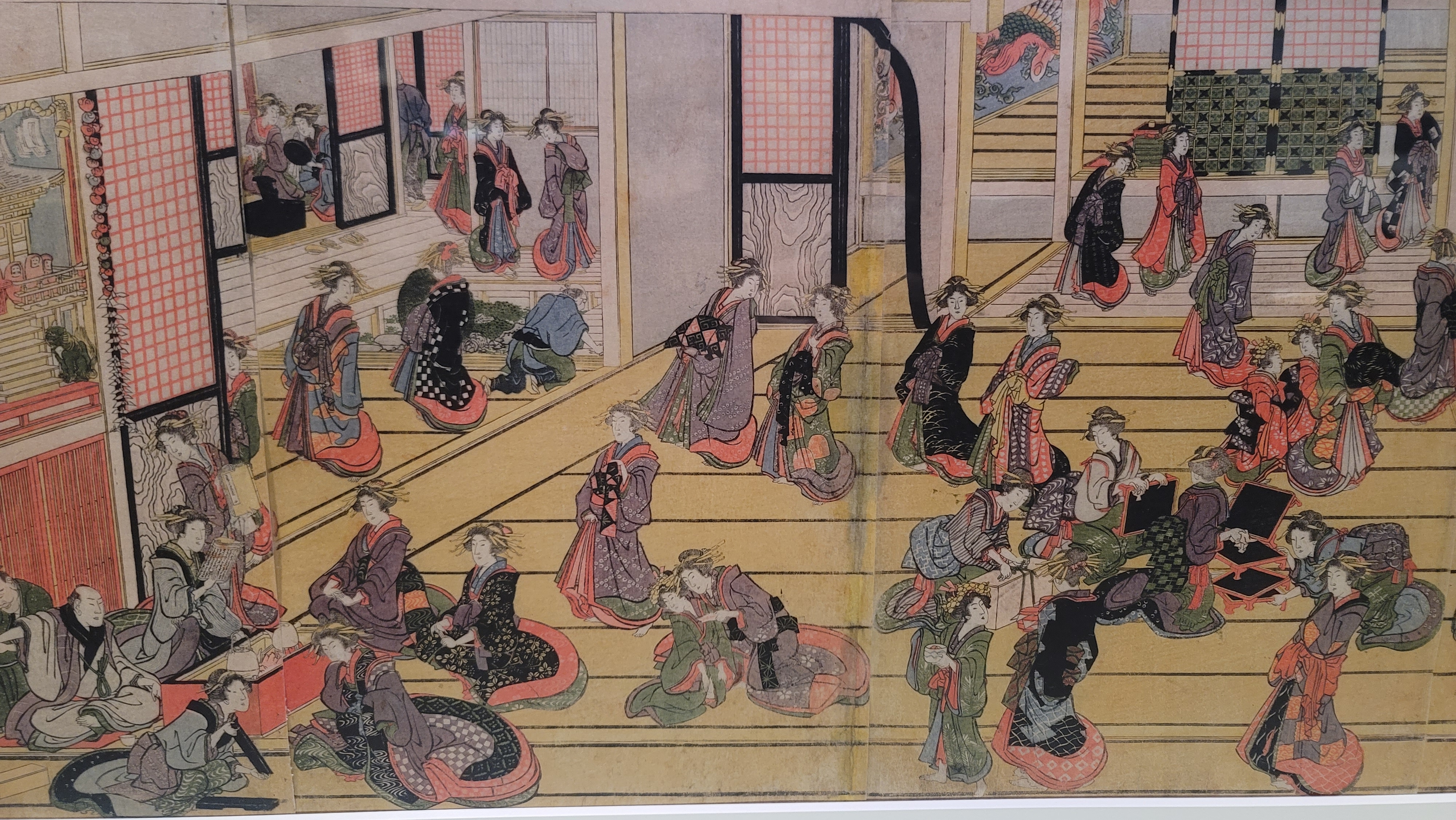 요시와라는 에도 시대의 유명한 유곽 지역. 새해를 맞아 요시와라의 여인들이 몸 단장을 하고 손님맞이 준비를 하며 기지개를 켜는 모습이 요란하게 그려져 있다.